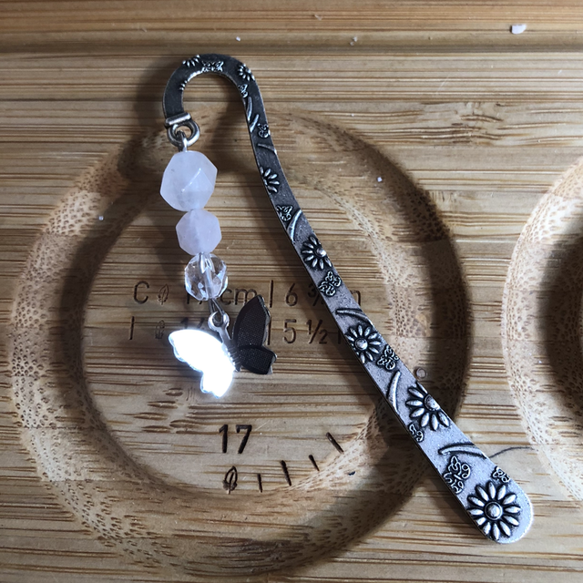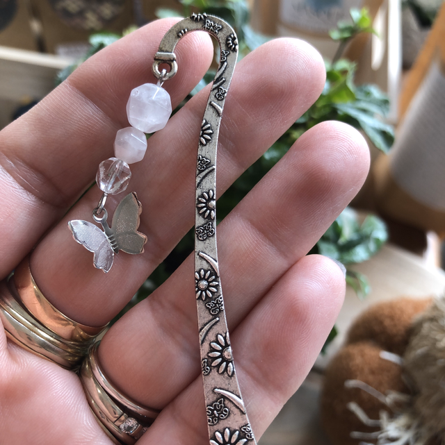 Marque page métal argenté 8 cm de hauteur et ses pierres en quartz rose et cristal de roche ainsi que sa breloque 😊